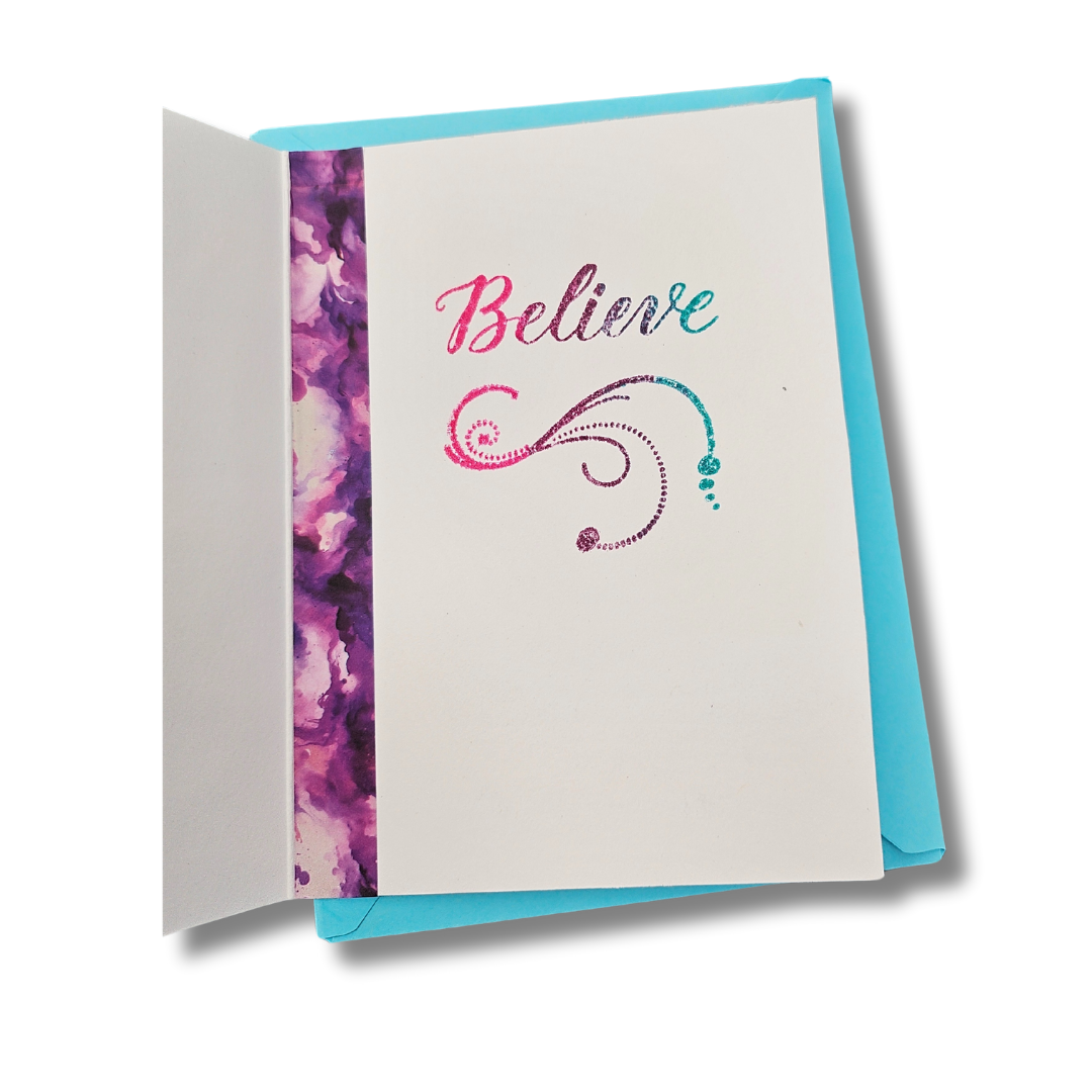 The inside sentiment, 'Believe,' perfectly complements the front message, 'Good Things Take Time.' This card is guaranteed to bring a smile to anyone's face.