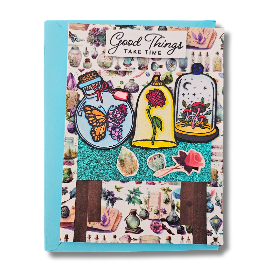 The 'Good Things Take Time' card features meticulously die-cut and hand-colored embellishments, adding a touch of whimsy and artistry. Crafted on high-quality 110 lb ream cardstock, this A2-sized card (4.25" x 5.5") provides a sturdy and luxurious feel. Each card comes with a color-coordinated, hand-folded, 65 lb ream cardstock envelope, completing the elegant presentation.